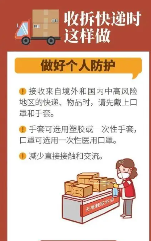 減少不必要網(wǎng)購(gòu),特別是不從中高風(fēng)險(xiǎn)區(qū)與國(guó)(境)外購(gòu)物。在接收快遞時(shí),應(yīng)全程佩戴口罩,建議先對(duì)外包裝進(jìn)行消毒,或者放置在通風(fēng)有陽光處靜置一段時(shí)間后再開包使用,拆包后的垃圾應(yīng)按垃圾分類處理。處理完畢后,清洗消毒雙手。如接收到涉疫快遞,應(yīng)主動(dòng)報(bào)告輔導(dǎo)員,并配合排查工作。