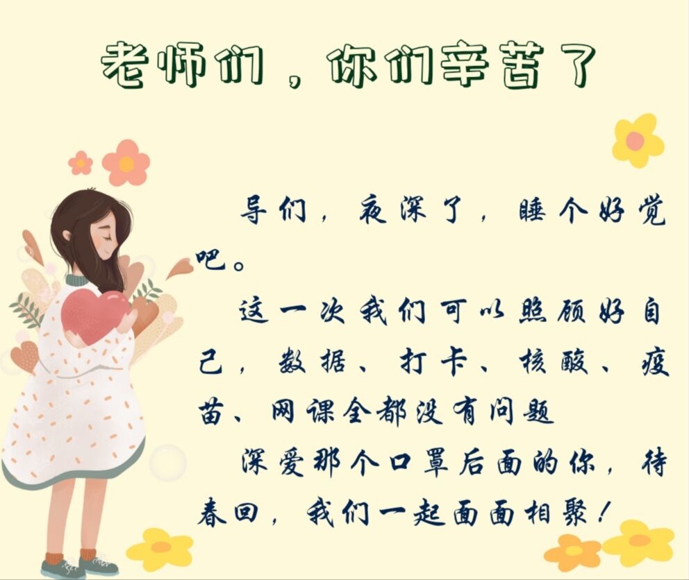 輔導(dǎo)員陳香:面對(duì)屬地突發(fā)疫情,班級(jí)同學(xué)凌晨出現(xiàn)發(fā)熱39℃的情況時(shí),第一時(shí)間送同學(xué)到屬地醫(yī)院發(fā)熱門診,全程陪同就診,測(cè)核酸、抽血、等待檢測(cè)報(bào)告……深夜就診的病人狀態(tài)不一,醫(yī)護(hù)人員需時(shí)時(shí)進(jìn)行消毒工作,此時(shí)能做的便是配合醫(yī)院工作,督促孩子戴好口罩、做好防護(hù)并疏導(dǎo)她放松心情……幸好學(xué)生檢測(cè)結(jié)果正常,回到學(xué)校已是凌晨三點(diǎn)。此時(shí)無(wú)比心安,守護(hù)學(xué)生,是初心也是使命!我始終相信,人人擔(dān)責(zé),同心抗疫,我們定能相約在春天里,共賞春暖花開(kāi)。
