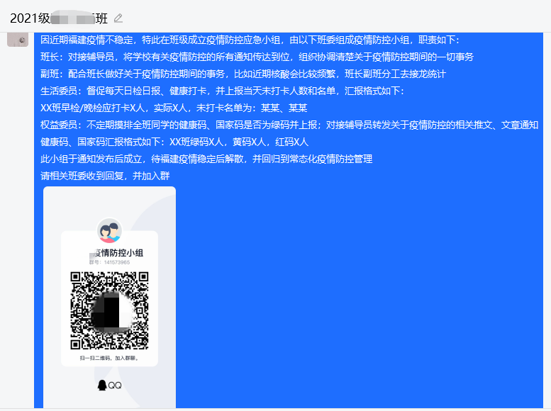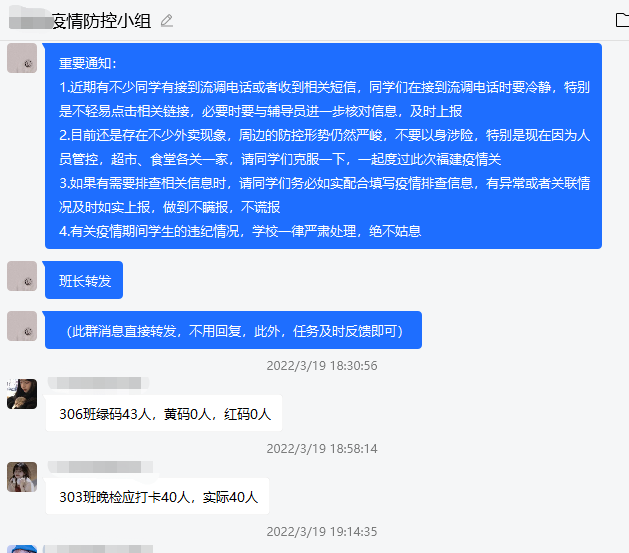 清晨醒來(lái),輔導(dǎo)員們的第一件事不是起床洗漱,而是馬上翻看手機(jī)是否有學(xué)生發(fā)來(lái)信息。每個(gè)夜晚,學(xué)生們已經(jīng)入睡,但是每個(gè)班級(jí)群里滿是輔導(dǎo)員發(fā)出的關(guān)于疫情防控的最新通知,即使凌晨回到宿舍,他們也處于隨叫隨到的狀態(tài)。