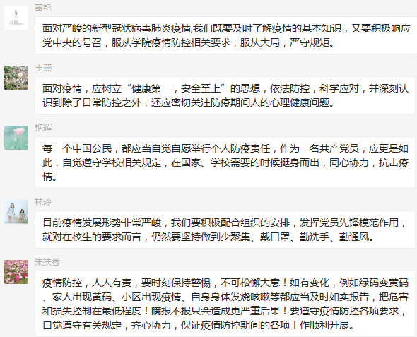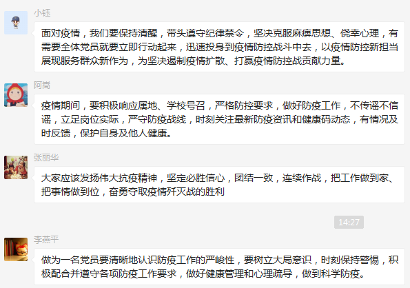 交流環(huán)節(jié)中,黨員們暢談心得體會,紛紛表示要認真貫徹學(xué)校疫情防控工作有關(guān)精神,大力宣傳科學(xué)防疫措施,不造謠、不傳謠,向身邊親友普及疫情防控知識,積極參與疫情防控工作,為堅決遏制疫情擴散,奪取疫情防控勝利貢獻一份力量。