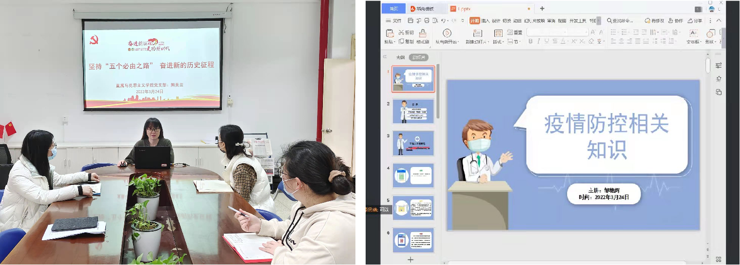 黨員教師們將偉大的抗疫精神融入黨性教育中,將疫情時(shí)刻的危機(jī)轉(zhuǎn)化為課程思政的契機(jī)。直屬馬克思主義學(xué)院黨支部書記熊美蘭為全體黨員教師開講《堅(jiān)持“五個(gè)必由之路”奮進(jìn)新的歷史征程》主題黨課,并通過(guò)課程集備,討論在課堂內(nèi)容中充分融入抗疫素材,將抗疫先進(jìn)事跡和理想信念教育有機(jī)融合,同時(shí)對(duì)學(xué)生做好心理疏導(dǎo)和正面引導(dǎo),鼓勵(lì)學(xué)生以積極的態(tài)度同心戰(zhàn)“疫”。藥學(xué)院第一黨支部結(jié)合疫情防控工作組織線上黨日活動(dòng),開展“抗擊疫情 奉獻(xiàn)有我”防疫宣講,并聯(lián)合藥學(xué)院團(tuán)總支舉辦防疫知識(shí)競(jìng)賽送香囊活動(dòng),通過(guò)活動(dòng)引導(dǎo)學(xué)生樹立“從我做起,積極防疫”的意識(shí),肩負(fù)起疫情防控的使命。