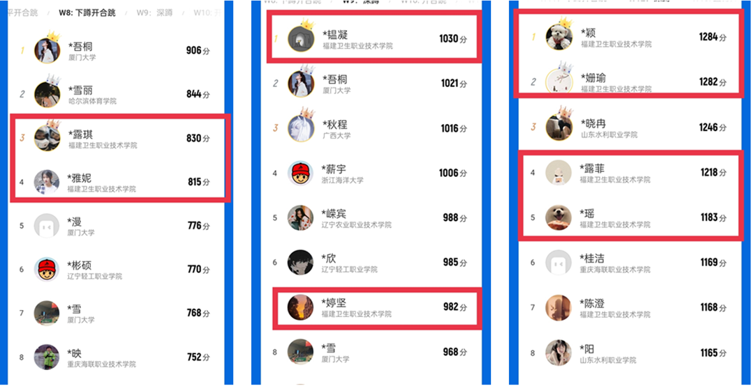 在體能賽周賽中,我校學(xué)生多次獲得佳績,在下蹲開合跳和深蹲項(xiàng)目中成績尤為突出,多名同學(xué)名列前十榜內(nèi)。