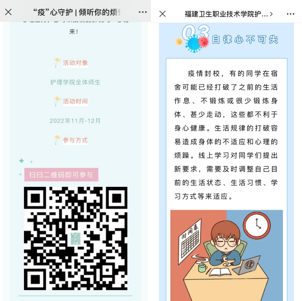 疫情期間,護(hù)理學(xué)院開通疫情心理疏導(dǎo)綠色通道,向有需要的學(xué)生提供及時(shí)、有效的心理疏導(dǎo)服務(wù),為師生心理健康保駕護(hù)航,筑牢校園抗疫“心”長城。加強(qiáng)疫情期間心理健康宣傳教育,普及疫情防控健康衛(wèi)生和心理調(diào)適知識(shí),引導(dǎo)學(xué)生自覺遵守疫情防控要求,合理安排學(xué)習(xí)與休閑活動(dòng)。結(jié)合當(dāng)下青年熱點(diǎn),舉辦“我和我的萌寵”活動(dòng),幫助學(xué)生進(jìn)行心理調(diào)節(jié)與放松,廣受學(xué)生喜愛并熱烈參與。