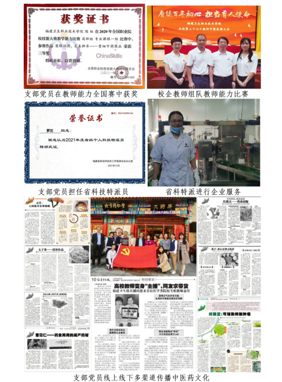 通過校企黨支部攜手共育技術(shù)技能型中藥人才,學(xué)生專業(yè)技能水平顯著提升,學(xué)生參加全國職業(yè)院校技能大賽高職組“中藥傳統(tǒng)技能賽項”比賽獲一等獎1項,二等獎4項,三等獎2項,參加福建省職業(yè)院校技能大賽高職組“中藥傳統(tǒng)技能賽項”比賽獲一等獎4項,二等獎8項,三等獎9項,參加企業(yè)中藥技能競賽獲金獎。豐富多彩的第二課堂從德智體美勞對學(xué)生進(jìn)行全方位培養(yǎng)。(附件5,6,7)