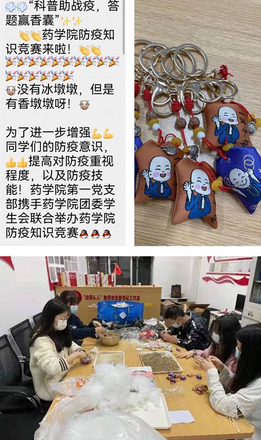 同時,為加大疫情防控知識的宣傳力度,增強學(xué)生的自我防護意識,支部黨員指導(dǎo)入黨積極分子制作中藥防疫香囊,聯(lián)合藥學(xué)院團總支開展“科普助戰(zhàn)疫,答題贏香囊”防疫知識線上競賽。