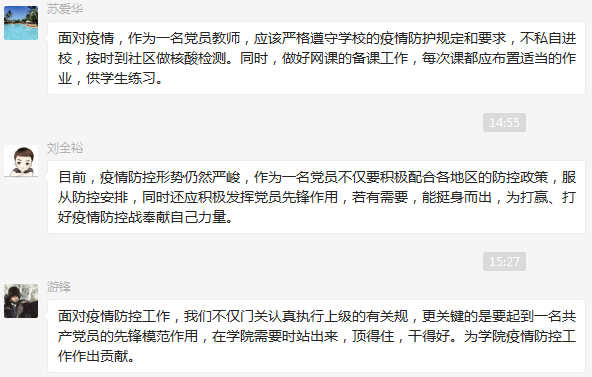 交流環(huán)節(jié)中,黨員們暢談心得體會,紛紛表示要認真貫徹學(xué)校疫情防控工作有關(guān)精神,大力宣傳科學(xué)防疫措施,不造謠、不傳謠,向身邊親友普及疫情防控知識,積極參與疫情防控工作,為堅決遏制疫情擴散,奪取疫情防控勝利貢獻一份力量。