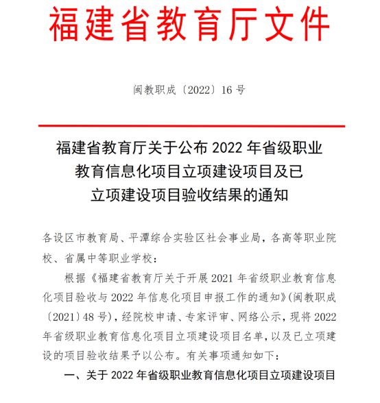 近日,福建省教育廳公布2022年省級職業(yè)教育信息化項目立項建設(shè)項目名單和已立項建設(shè)項目驗收結(jié)果,我校5個項目獲批立項,3個項目通過驗收。