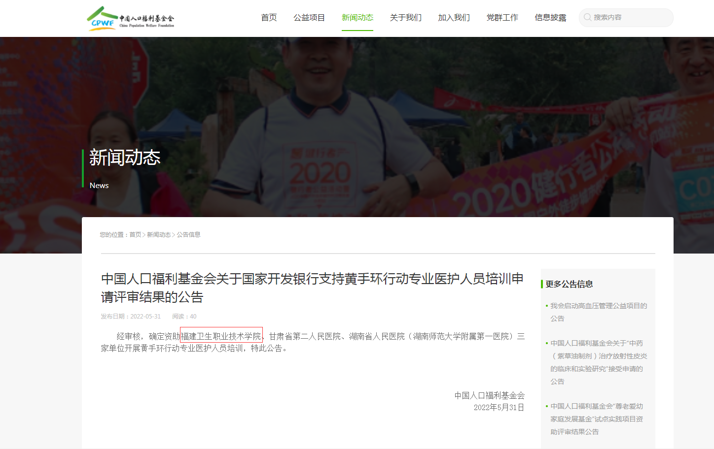 2022年5月31日,中國人口福利基金會公布關(guān)于國家開發(fā)銀行支持黃手環(huán)行動專業(yè)醫(yī)護人員培訓(xùn)評審結(jié)果,我校獲批開展黃手環(huán)行動專業(yè)醫(yī)護人員培訓(xùn),全國僅三家單位獲此資格。