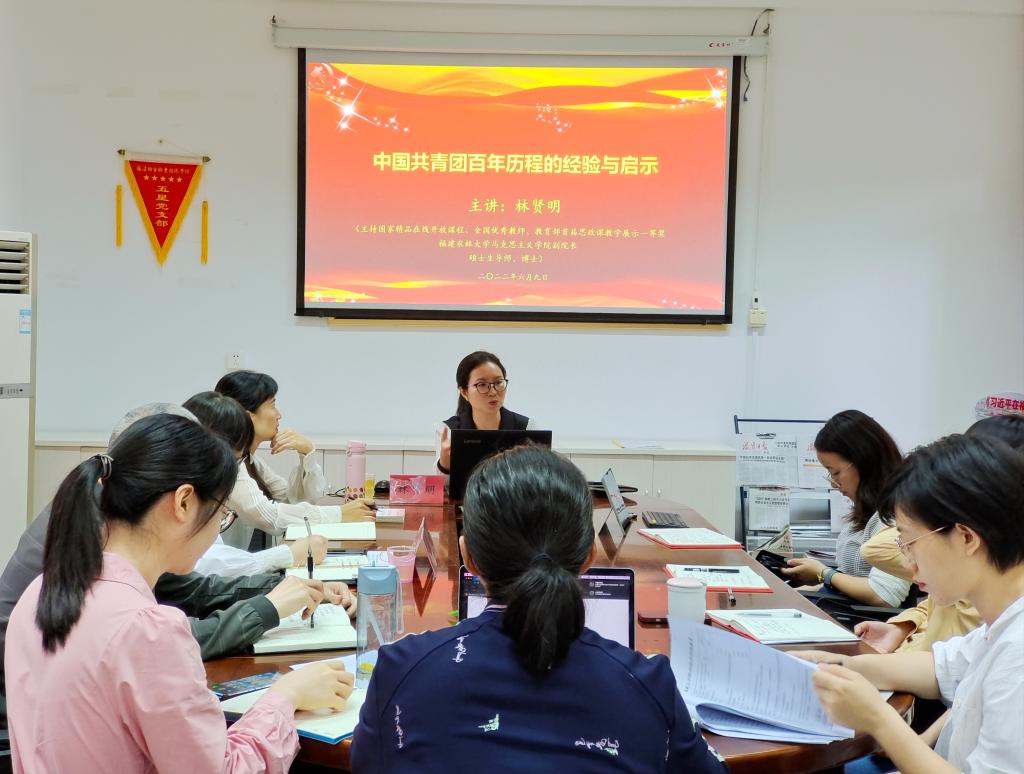 為從中國共青團百年歷程中汲取精神力量,做好青年思想政治教育工作,2022年6月9日,我校馬克思主義學院邀請福建農(nóng)林大學馬克思主義學院副院長林賢明作題為《中國共青團百年歷程的經(jīng)驗與啟示》的專題講座。講座由馬克思主義學院院長熊美蘭主持,全體專兼職思政課教師、學生代表參加講座。