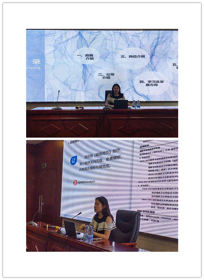 時值110周年校慶,9月9日下午,醫(yī)學(xué)技術(shù)系還特邀在校期間擔(dān)任18級影像303(放療班)班長、福建省腫瘤醫(yī)院實習(xí)隊副隊長 、創(chuàng)新創(chuàng)業(yè)“械診港”醫(yī)療設(shè)備維修平臺項目負(fù)責(zé)人,現(xiàn)就職于福建國藥器械有限公司擔(dān)任副董事長助理的優(yōu)秀校友林詩婷來校參與入學(xué)教育。她以現(xiàn)就職公司情況和招聘崗位需求為例,拓展同學(xué)們對專業(yè)行業(yè)的認(rèn)知,鼓勵同學(xué)們跟上時代腳步,打破固有思維壁壘,樹立就業(yè)多元化交叉思維。林詩婷還分享交流了自身在校的學(xué)習(xí)、實習(xí)、求職感悟及職場工作經(jīng)驗,勉勵新入學(xué)的學(xué)弟學(xué)妹們珍惜在校園的學(xué)習(xí)機會,積極利用一切校內(nèi)外資源提升專業(yè)技能和擴展興趣愛好,豐富業(yè)余生活,為將來走出校園進入社會打下堅實牢固的基礎(chǔ)。