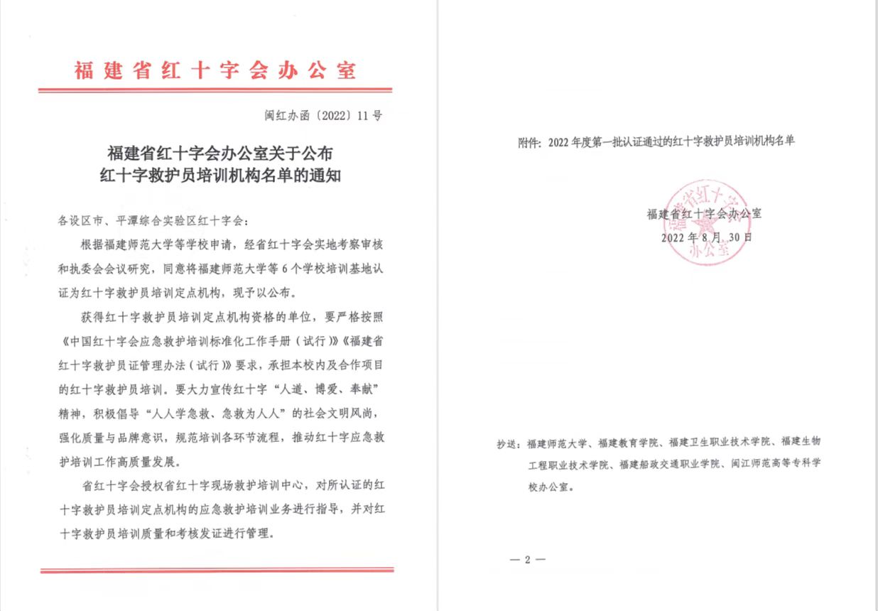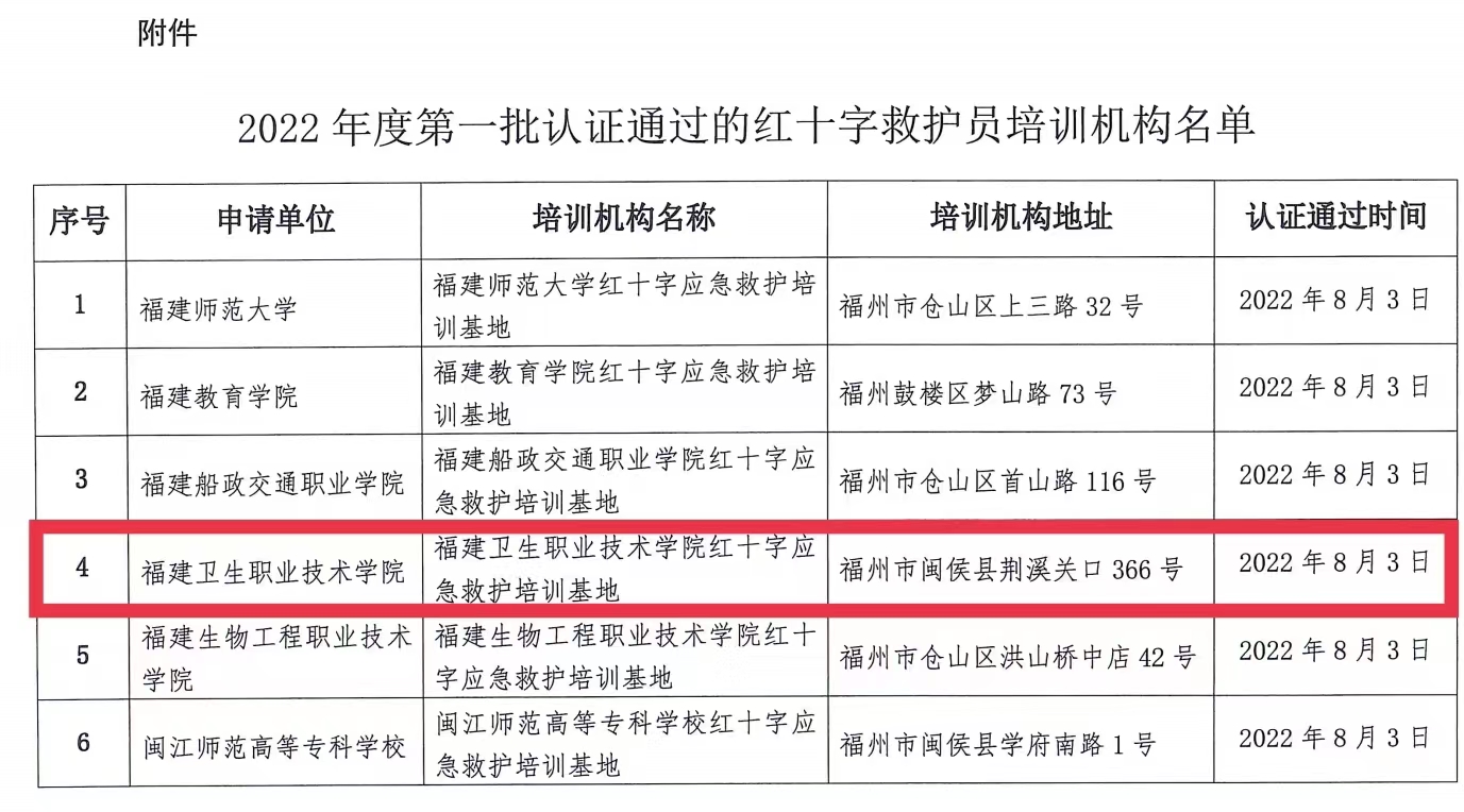 近日,福建省紅十字會辦公室公布了《紅十字救護(hù)員培訓(xùn)機(jī)構(gòu)名單的通知》,經(jīng)福建省紅十字會實(shí)地考察審核,我校被認(rèn)證為紅十字救護(hù)員培訓(xùn)定點(diǎn)機(jī)構(gòu)。