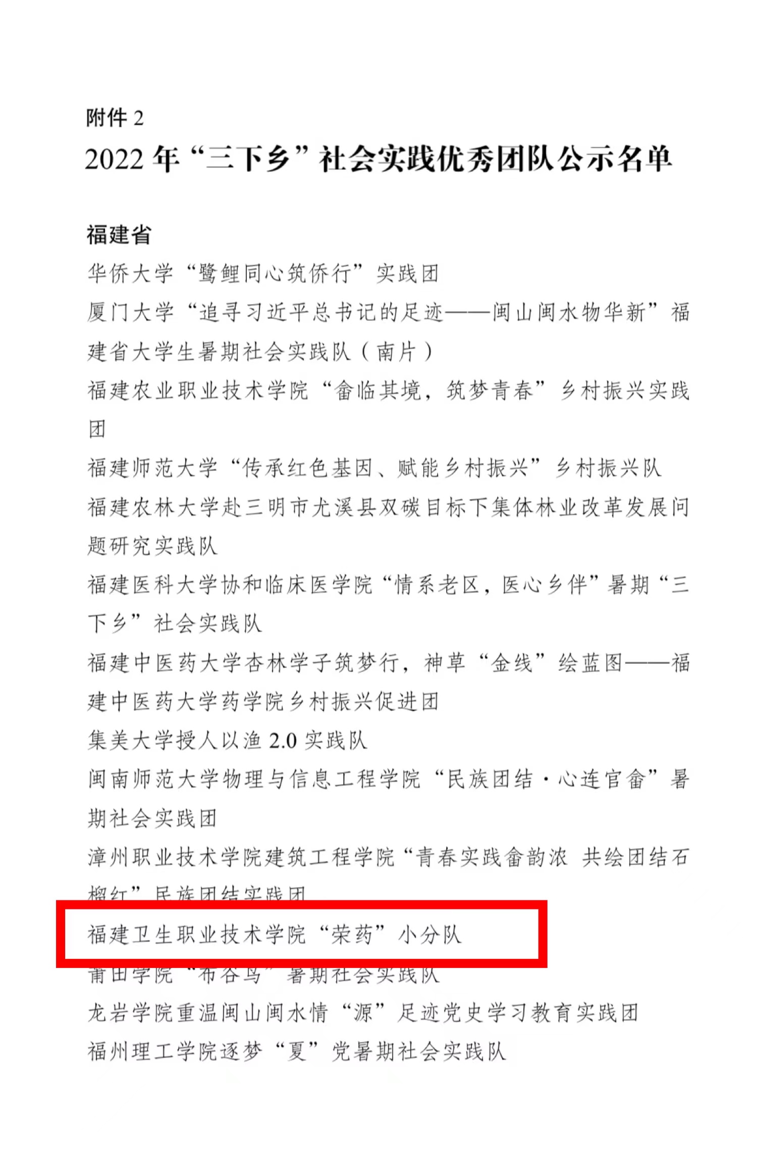 近日,共青團(tuán)中央通報(bào)表揚(yáng)一批在2022年“三下鄉(xiāng)”社會(huì)實(shí)踐活動(dòng)中表現(xiàn)突出的優(yōu)秀集體、個(gè)人和項(xiàng)目,并通過新媒體平臺(tái)廣泛進(jìn)行典型事跡做法宣傳。我校藥學(xué)院“榮藥”小分隊(duì)經(jīng)校級(jí)申報(bào)、省級(jí)團(tuán)委審核推薦、組織評(píng)議等環(huán)節(jié),最終獲得全國優(yōu)秀團(tuán)隊(duì)榮譽(yù)稱號(hào)。