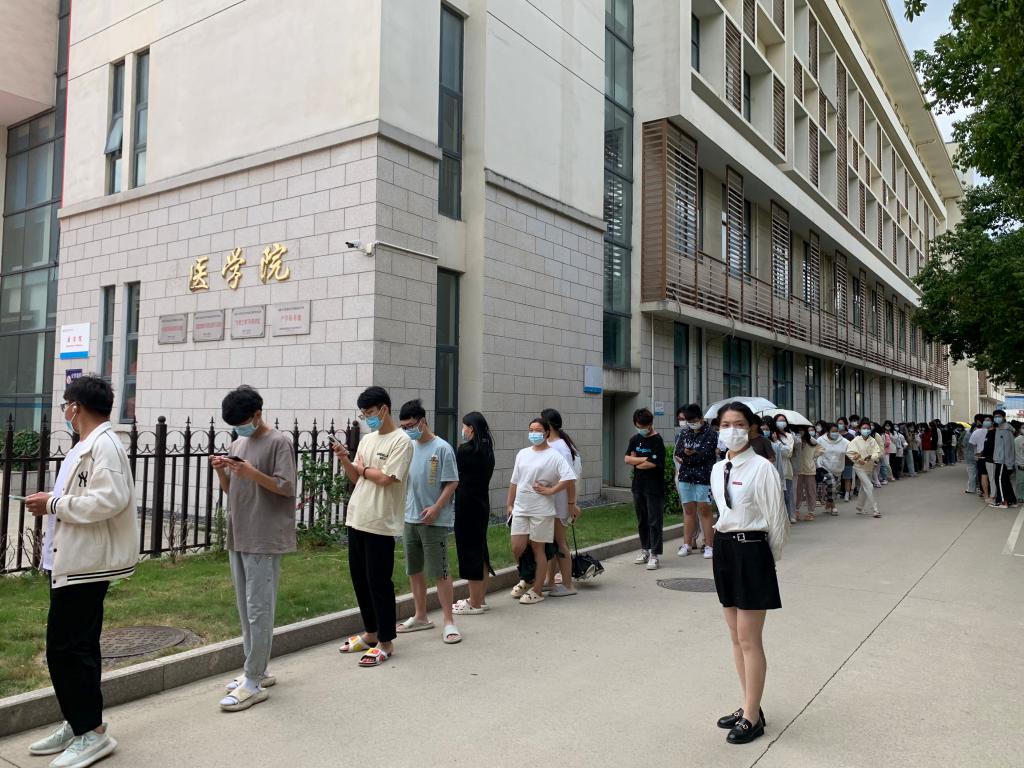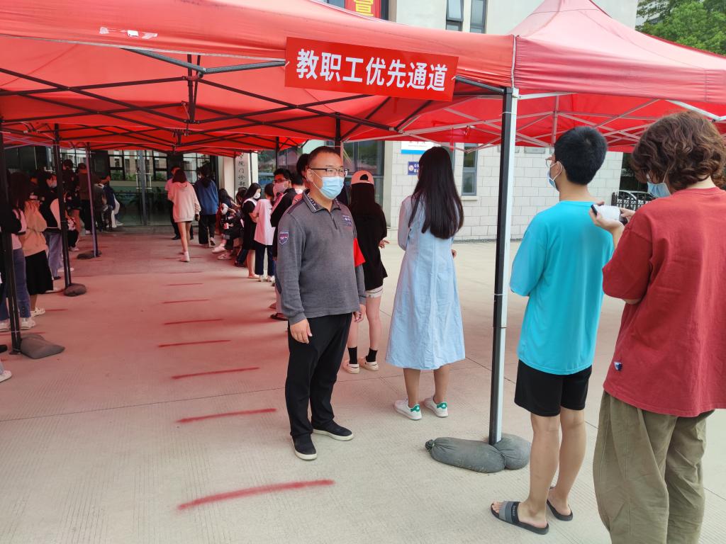 機(jī)關(guān)黨員和輔導(dǎo)員在核酸檢測(cè)點(diǎn)維持秩序