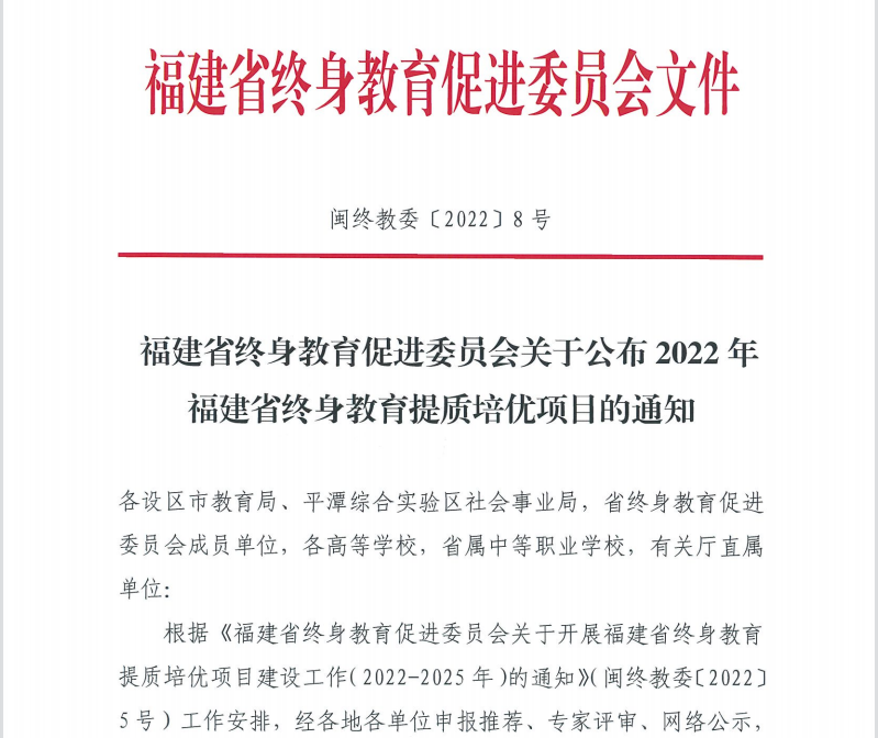 福建省終身教育提質(zhì)培優(yōu)項目是福建省貫徹中共中央、國務(wù)院《關(guān)于加強(qiáng)新時代老齡工作的意見》的重大舉措,旨在多渠道擴(kuò)大社區(qū)教育、老年教育資源供給,完善我省終身教育服務(wù)體系,打造具有福建特色的終身教育發(fā)展模式,助力“構(gòu)建服務(wù)全民終身學(xué)習(xí)的教育體系”。經(jīng)專家評審,2022年福建省終身教育提質(zhì)培優(yōu)項目共入選終身教育創(chuàng)新基地6個、終身教育實驗項目12個、示范性社區(qū)(老年)學(xué)校(學(xué)習(xí)中心)21個、社區(qū)(老年)教育鄉(xiāng)土教材10冊、社區(qū)(老年)教育課程資源78門、高校老年大學(xué)4所、學(xué)習(xí)型社區(qū)(村)19個、終身教育重點(diǎn)研究課題立項15個、終身教育一般研究課題立項83個。
