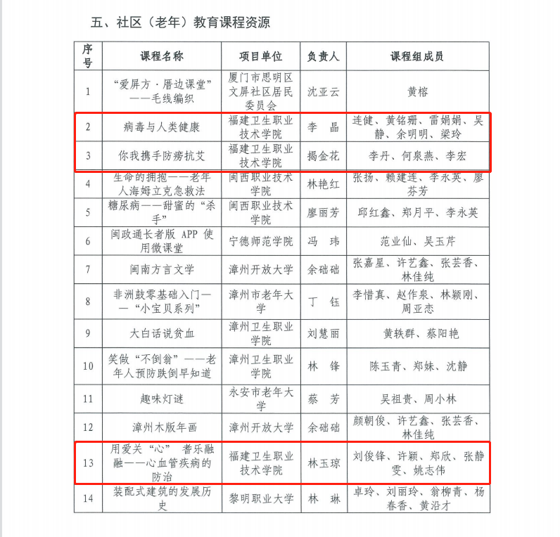 近日,福建省終身教育促進(jìn)委員會公布了2022年福建省終身教育提質(zhì)培優(yōu)項目,我校申報的3項課程全部入選社區(qū)(老年)教育課程資源,分別為醫(yī)學(xué)技術(shù)系李晶老師負(fù)責(zé)的課題《病毒與人類健康》、健康管理系揭金花老師負(fù)責(zé)的課題《你我攜手防癆抗艾》、醫(yī)學(xué)院林玉瓊老師負(fù)責(zé)的課題《用愛關(guān)“心”耆樂融融——心血管疾病的防治》。
