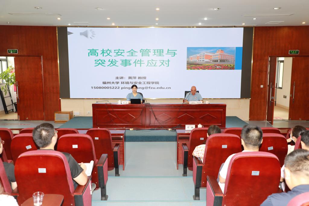 為進一步落實校園安全主體責(zé)任,強化教職員工應(yīng)對突發(fā)事件的應(yīng)急處置能力。8月31日下午,學(xué)校特邀福州大學(xué)環(huán)境與安全工程學(xué)院黃萍教授為我校作《高校安全管理與突發(fā)事件應(yīng)對》專題安全講座,全體中層干部、實訓(xùn)中心負(fù)責(zé)人、輔導(dǎo)員及各部門安全員參加會議。