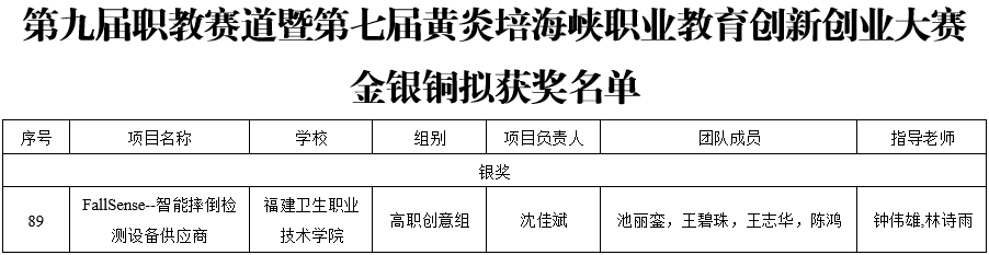 近日,第九屆福建省“互聯(lián)網(wǎng)+”大學(xué)生創(chuàng)新創(chuàng)業(yè)大賽職教賽道暨第七屆黃炎培海峽職業(yè)教育創(chuàng)新創(chuàng)業(yè)大賽在黎明職業(yè)大學(xué)舉行。我校報送的參賽項目《FallSense——智能摔倒檢測設(shè)備供應(yīng)商》在省賽網(wǎng)評中勝出,參加本次現(xiàn)場決賽并獲得銀獎。