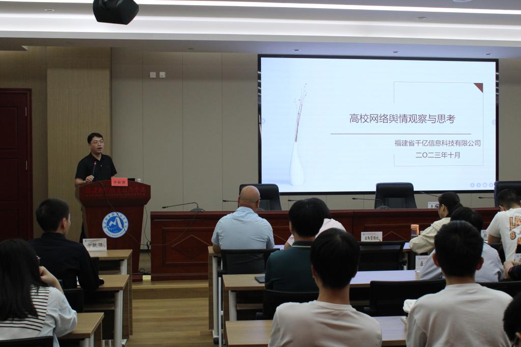 會(huì)議還邀請(qǐng)福建省千億信息科技有限公司總經(jīng)理、高級(jí)工程師方敏強(qiáng)做《高校網(wǎng)絡(luò)輿情觀察與思考》的講座,對(duì)全國(guó)、全省高校網(wǎng)絡(luò)輿情情況進(jìn)行介紹,對(duì)我校網(wǎng)絡(luò)輿情情況進(jìn)行分析。通過(guò)本次專題講座,參會(huì)人員受益匪淺,表示要進(jìn)一步加強(qiáng)學(xué)校網(wǎng)絡(luò)信息安全工作,主動(dòng)學(xué)習(xí)、掌握規(guī)律,做好信息溝通、輿情監(jiān)控、風(fēng)險(xiǎn)研判,不斷健全學(xué)校網(wǎng)絡(luò)輿情綜合性防控體系,促進(jìn)學(xué)校意識(shí)形態(tài)工作整體進(jìn)一步提升。