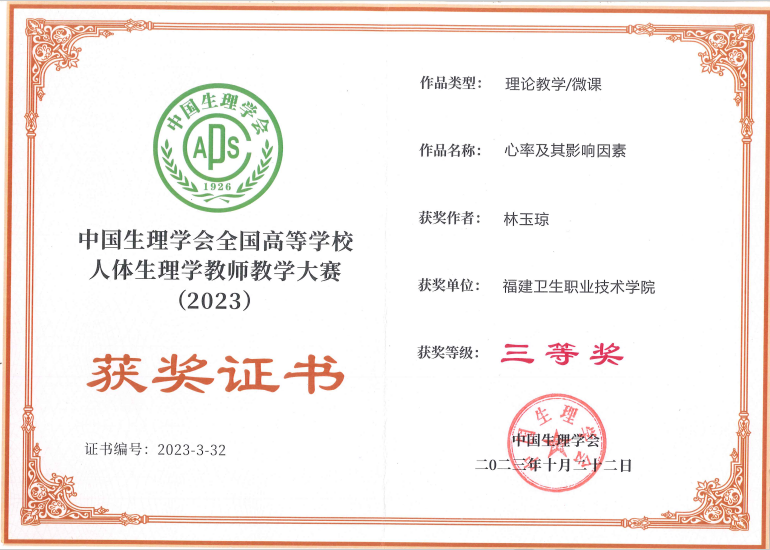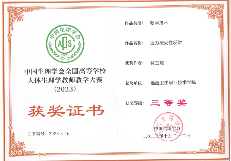 2023年10月22日,由中國生理學(xué)會教育工作委員會主辦的首屆“泰盟杯”中國生理學(xué)會全國高等學(xué)校人體生理學(xué)教師教學(xué)大賽成績公布。我校醫(yī)學(xué)院教師林玉瓊的作品《心率及其影響因素》和《壓力感受性反射》分別獲得理論教學(xué)(微課)賽道和教學(xué)技術(shù)賽道三等獎。
