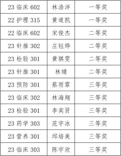 最終,23級臨床(高本貫通)專業(yè)林浩洋、22級護(hù)理專業(yè)黃道凱等同學(xué)在比賽中取得了優(yōu)異的成績,分別榮獲一、二、三等獎(jiǎng)。