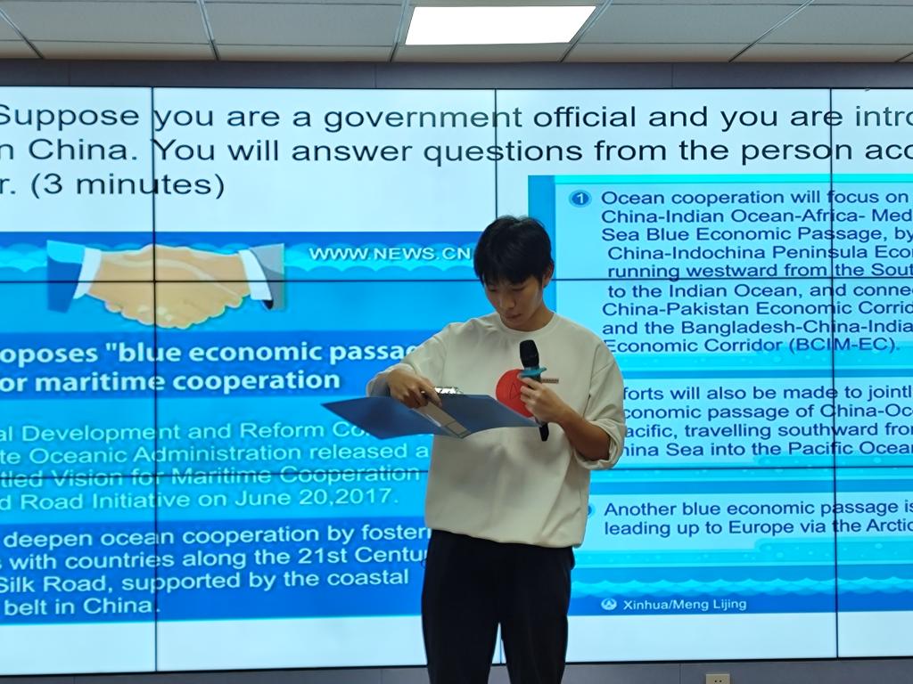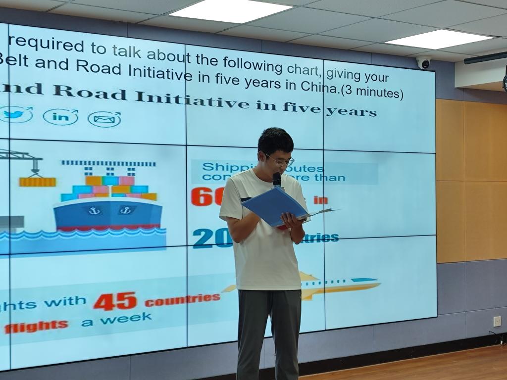 本次比賽共有200多名選手在初賽中進(jìn)行激烈地角逐,選手們表現(xiàn)優(yōu)異、各放異彩,共有12名選手從中脫穎而出,進(jìn)入決賽。為了讓入圍選手最大限度發(fā)揮自己的水平,老師們在賽前對參賽選手多次開展指導(dǎo)活動。決賽中,12名選手通過“現(xiàn)場描述”和“情景交流”兩個(gè)環(huán)節(jié)綻放光彩,用英文講述了我國“一帶一路”倡議,加深了對祖國共建共享規(guī)劃的認(rèn)識,表達(dá)了我校學(xué)子對國家繁榮發(fā)展的密切關(guān)注與自豪之情。