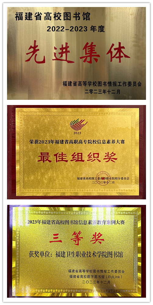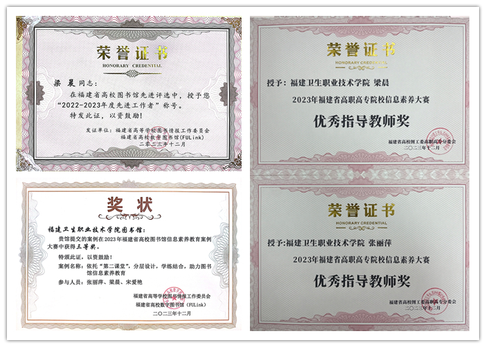 我校圖書館獲得福建省高校圖工委2022-2023年度先進(jìn)集體榮譽(yù)稱號(hào)及2023年福建省高職高專院校信息素養(yǎng)大賽最佳組織獎(jiǎng),梁晨獲得福建省高校圖工委2022-2023年度先進(jìn)工作者榮譽(yù)稱號(hào),我校圖書館報(bào)送的案例《依托“第二課堂”,分層設(shè)計(jì),學(xué)練結(jié)合,助力圖書館信息素養(yǎng)教育》獲得2023年福建省高校圖書館信息素養(yǎng)教育案例大賽三等獎(jiǎng),張麗萍獲得2023年福建省高職高專院校信息素養(yǎng)大賽先進(jìn)工作者榮譽(yù)稱號(hào),梁晨和張麗萍獲得2023年福建省高職高專院校信息素養(yǎng)大賽優(yōu)秀指導(dǎo)教師獎(jiǎng)。