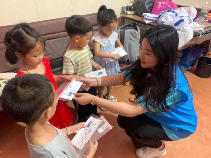 圖為志愿者給小朋友發(fā)放日常文具及口罩等。中國(guó)青年網(wǎng)通訊員 嚴(yán)靜怡 供圖