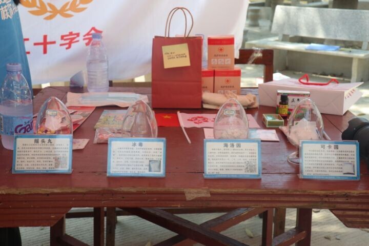 圖為仿真毒品模型及為居民準(zhǔn)備的藥品禮袋。中國(guó)青年網(wǎng)通訊員 嚴(yán)靜怡 供圖?
