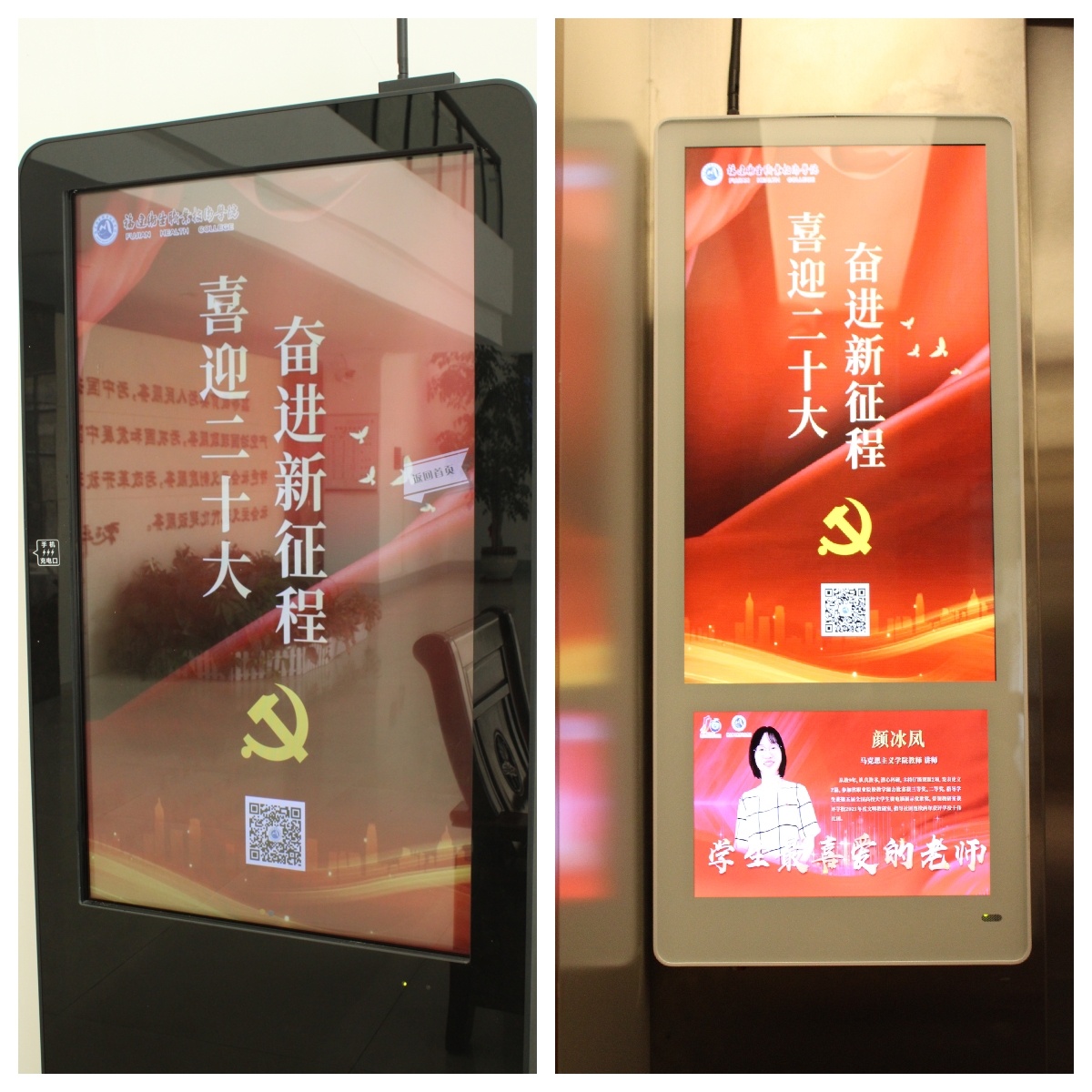 在黨的二十大即將召開之際,校園內(nèi)的led屏滾動播放喜迎二十大宣傳圖片,多處懸掛宣傳標(biāo)語、海報,讓愛黨愛國的意識深入每一位師生心田。