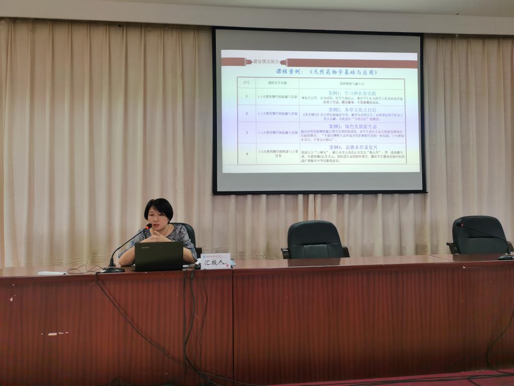 隨后,教務(wù)處處長朱扶蓉以《天然藥物學(xué)基礎(chǔ)與應(yīng)用》課程思政示范項(xiàng)目建設(shè)與申報(bào)為例,介紹了從2018年11月開始對課程思政建設(shè)的思考與探索,到2021年5月入選教育部課程思政示范課程、教學(xué)名師及教學(xué)團(tuán)隊(duì)的兩年半建設(shè)歷程,從課程思政建設(shè)總體設(shè)計(jì)、每個(gè)案例蘊(yùn)含的思政元素、修訂人才培養(yǎng)方案和課程標(biāo)準(zhǔn)、撰寫制作課程思政案例和視頻、出版收錄課程思政案例和視頻的創(chuàng)新融合教材,到項(xiàng)目申報(bào)材料每個(gè)細(xì)項(xiàng)的撰寫都進(jìn)行了詳細(xì)的說明,并從教育情懷、政策研讀、理論學(xué)習(xí)、團(tuán)隊(duì)協(xié)作、深度教研、資源建設(shè)、精準(zhǔn)契合、成果固化、參賽獲獎(jiǎng)和凝練總結(jié)等十個(gè)方面作了建設(shè)經(jīng)驗(yàn)的分享,博得了在座全體教師的熱烈掌聲。