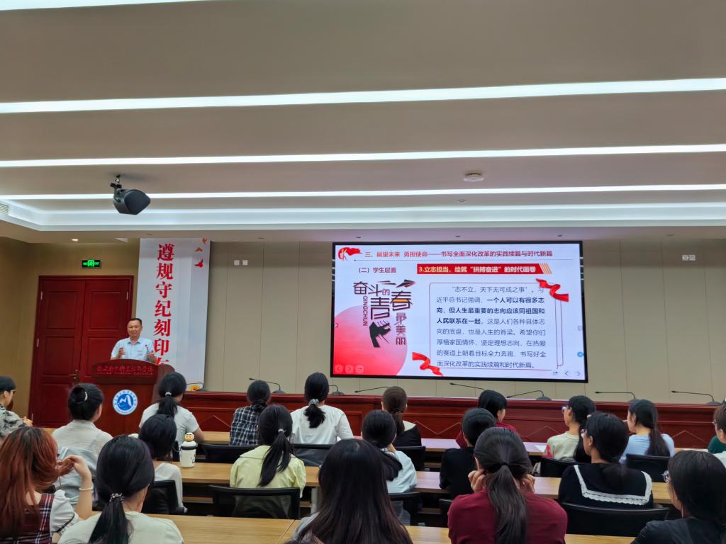 9月12日下午,校黨委書記曾武祈以“同心擘畫改革新藍圖 攜手奮進強國新征程”為題,走進24護理303、304班為我校師生專題宣講黨的二十屆三中全會精神暨秋季開學(xué)第一課。